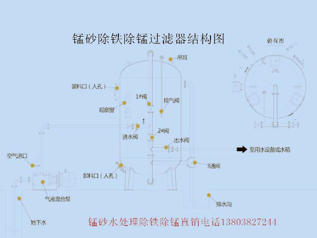 系統(tǒng)配置:井水自吸泵,曝氣裝置,沉淀池,原水增壓泵,錳砂除鐵除錳器,活性碳過濾器,凈水池。除鐵除錳過濾器產(chǎn)水率:95%。