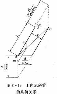 以上向流斜管沉淀池為例,分析沉淀區斜管尺寸問題,下向流斜管斜板沉淀池原理與此相同,不多敘述。為了分析方便,取上向流斜管為矩形,斜管的縱剖面如圖3-19所示;